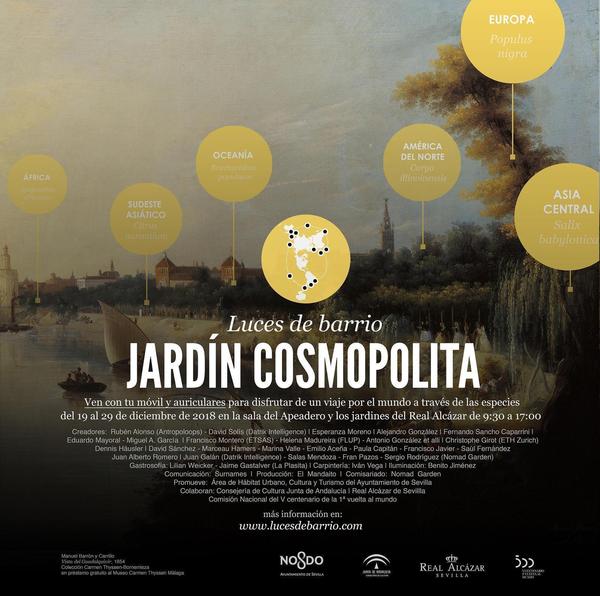 Del día 19 al 29 de diciembre de 2018, Luces de barrio llega al Real Alcázar de Sevilla de la mano de once equipos de creadores visuales, sonoros, gastronómicos, etc. para descubrir el Jardín Cosmopolita que habita en los 11 distritos de la ciuda