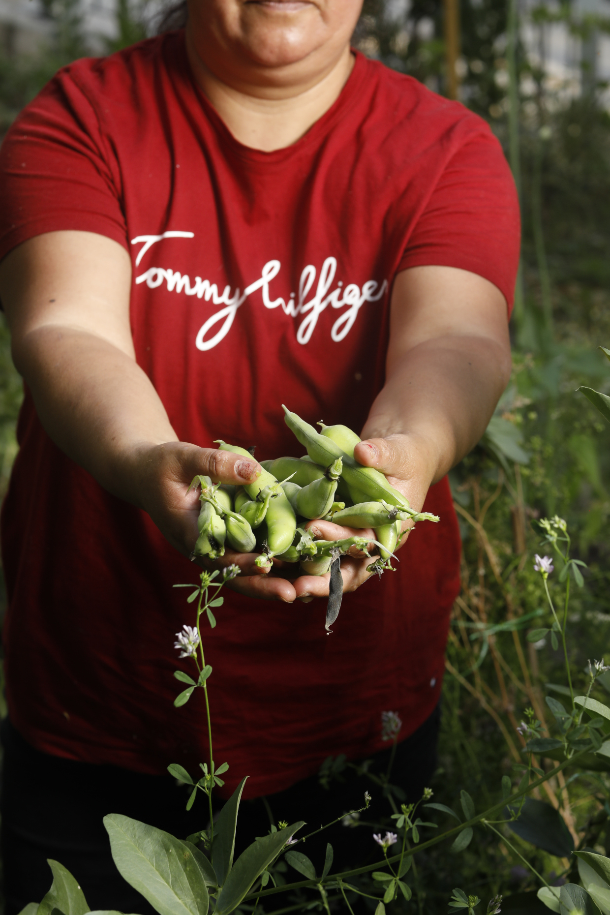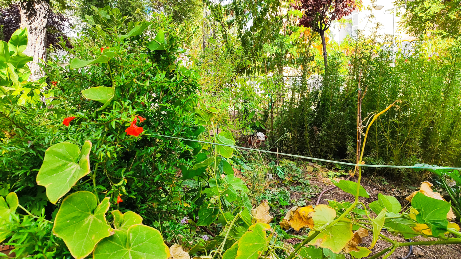 La promotota del jardín fue María, que durante la pandemia decidió poner sus buenas manos con las plantas en un parterre duro y yermo. Al principio María cargó con todo el peso de su creación ayudada por su pareja y por su nieta. Fueron mejorando el suelo añadiendo tierra y los residuos orgánicos que compostaban en casa. Consiguieron levantar un vergel: plantas hortícolas, árboles frutales, plantas originarias de su país, Ecuador, aromáticas, yucas, olivos, ...
